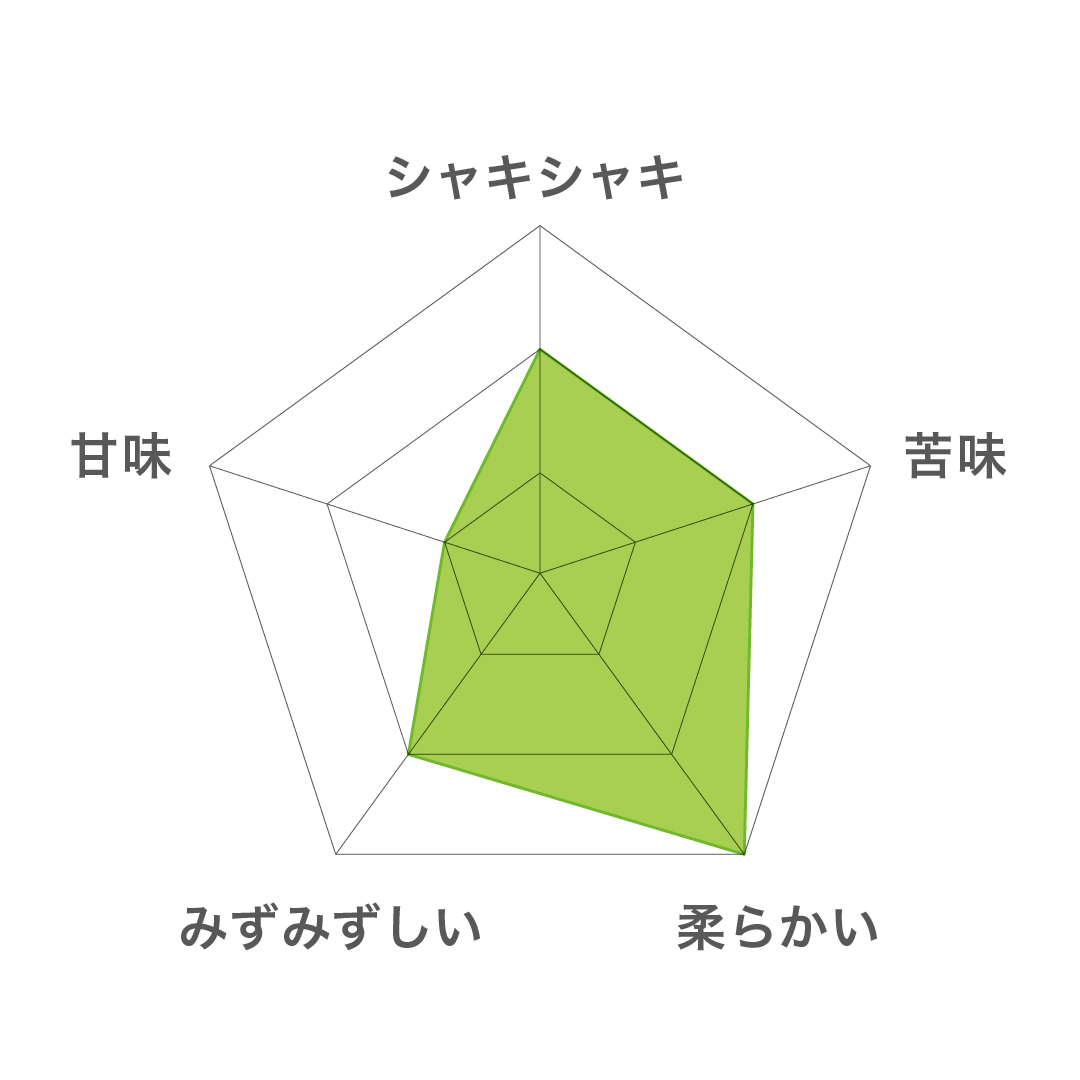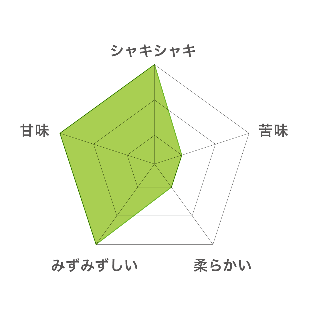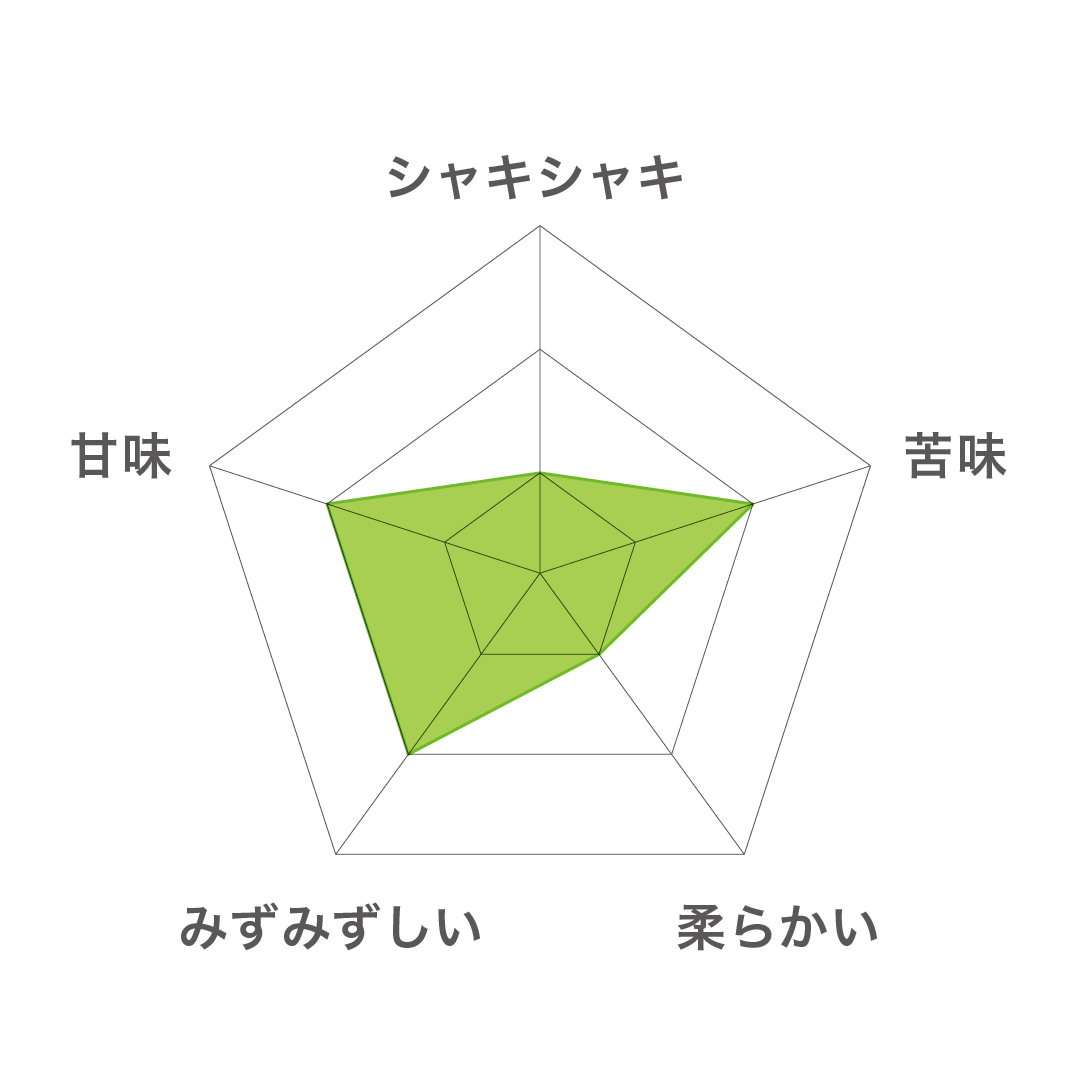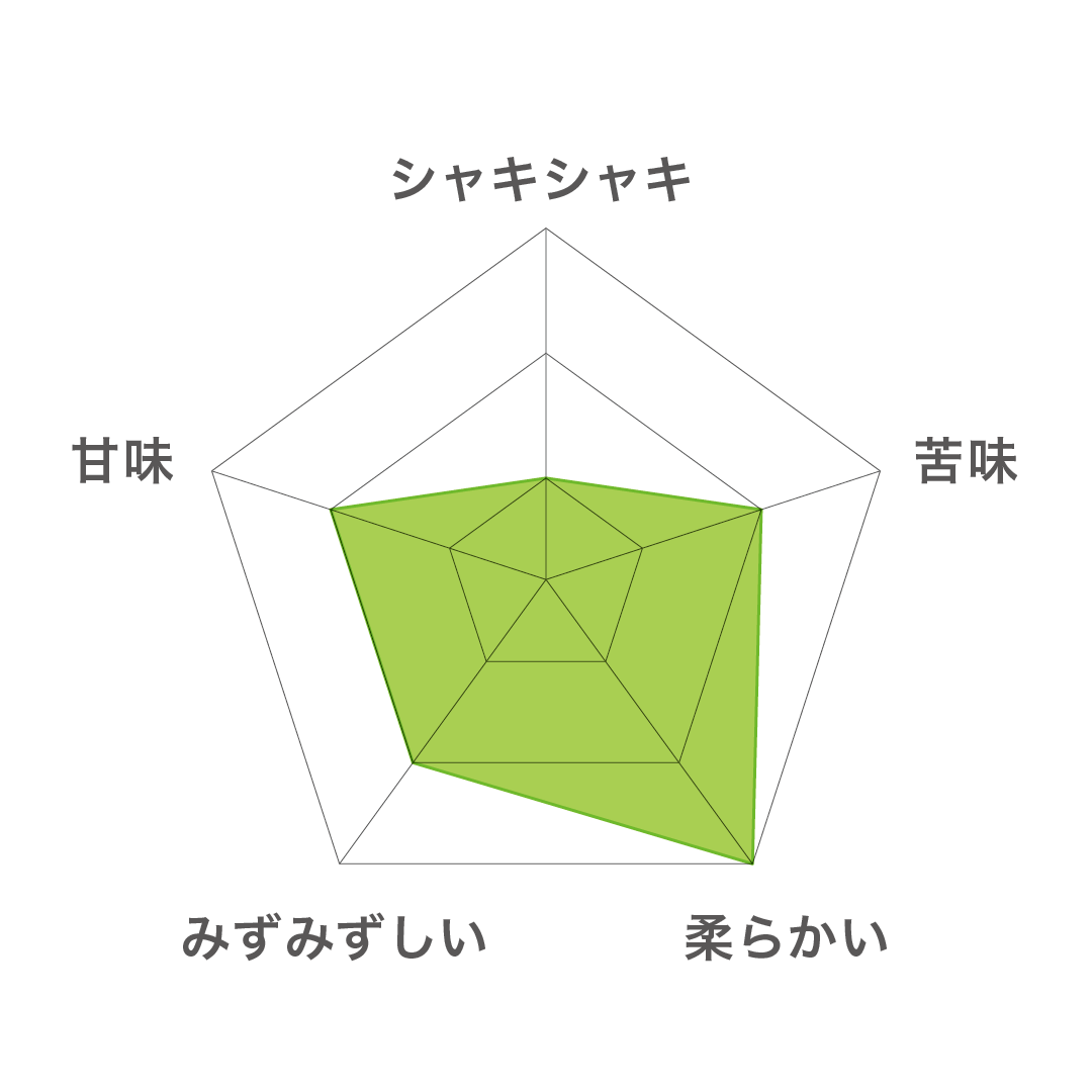見た目は鮮やかな緑色をしており、やや大きめな葉が印象的なリーフレタスです。食味は甘味と苦味のバランスが良い味わいです。葉質が非常に柔らかい品種なので、ふんわりした食感を楽しめます。また、柔らかい食感はシニア層や離乳食にも食べやすくてオススメです。